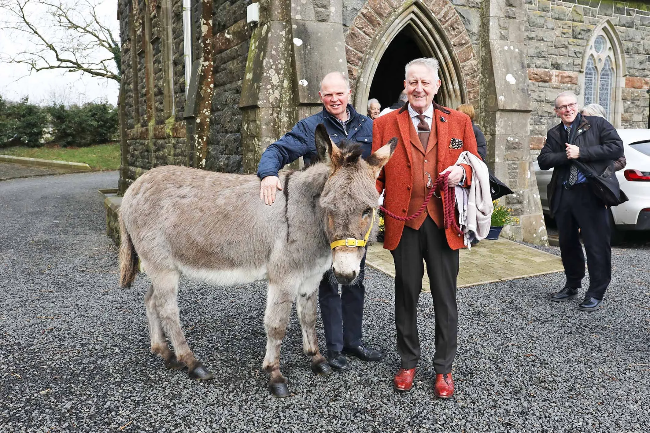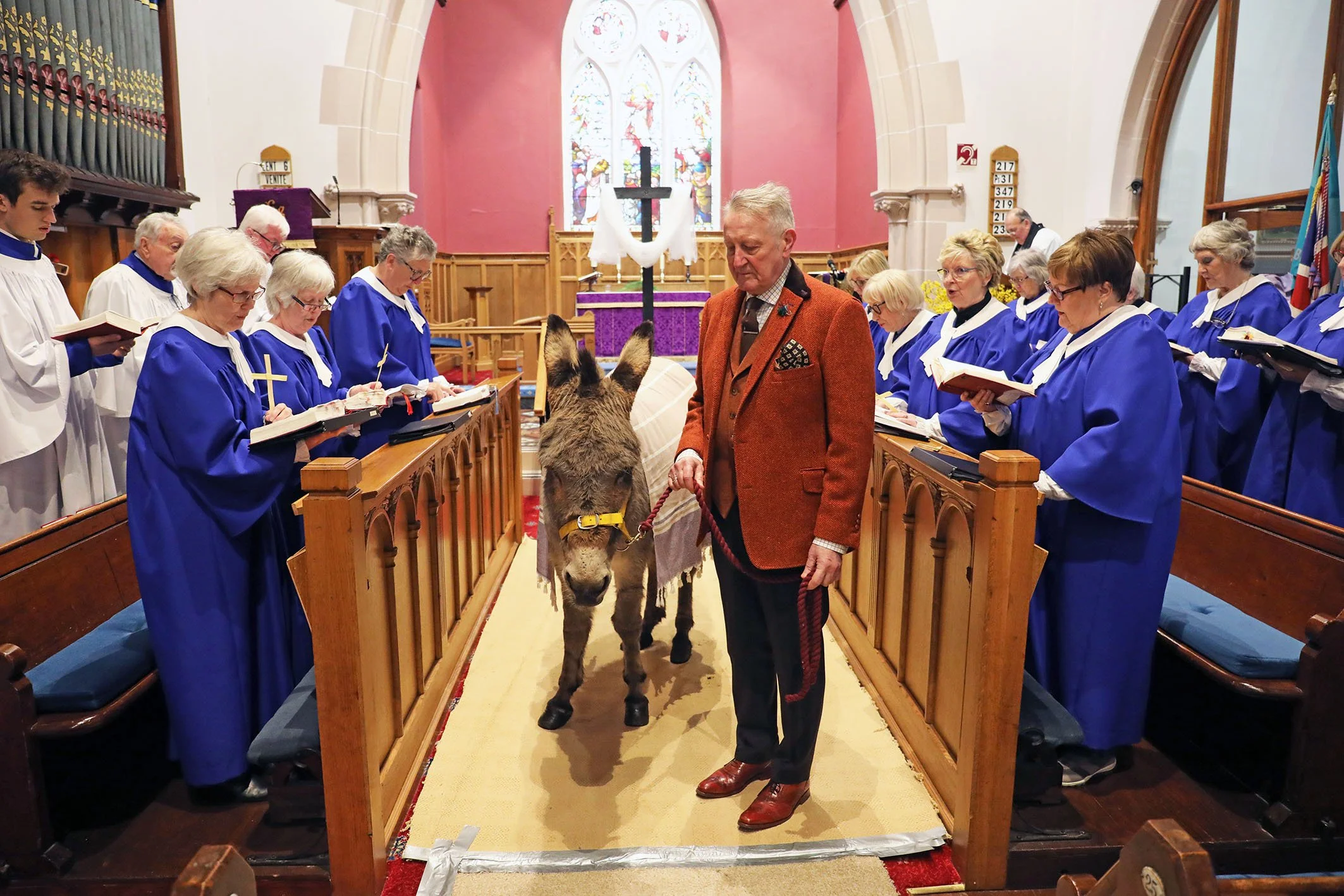 Palm Sunday marks the beginning of Holy Week and in normal circumstances the Procession of Palms would be led by Annie the donkey, symbolic of the colt that Jesus rode into Jerusalem before his crucifixion. Unfortunately this morning the weather turned very nasty with rain and a strong wind so the decision was made not to process from the Parish Hall up to the church. However Annie was able to follow the choir into the church led by the Rector’s church warden, James Christie. James has been riding horses for many years and Annie was quite at ease with him walking up the aisle as everyone sang the traditional Palm Sunday hymn, All Glory, Laud and Honour.