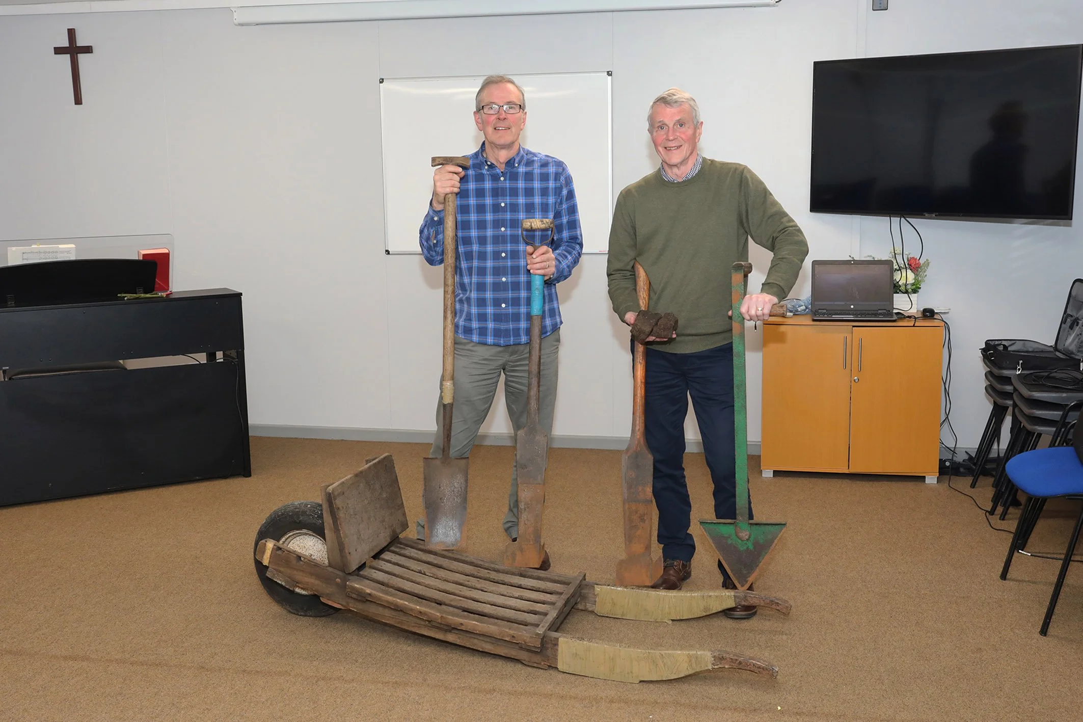 The Watchmen had a very interesting presentation this evening, again given by George and David Rea . George and David once cut peat on a hill near Slemish called Carriff Moss, Carnalbanagh, and in the presentation George talked about the whole process of preparing the bog, from removing the top layer of vegetation to access the peat below, cutting the peat with a variety of different spades and techniques, laying it out to dry and, dependent on the weather, taking it home a few weeks later to store, ready to burn during the long winter months ahead. George introduced some unique terminology in his talk, words and terms such as the scraw - the top sod of vegetation on the bank of peat that needs to be removed first, flaughter - a tool used to cut into the scraw, peat coom - the debris left behind on the floor of a peat shed and slean - the traditional name for a peat spade. Many of the words are derived from old Irish words. The presentation had many interesting photographs of very happy times spent working up at the ‘moss’ with their father James and a number of other local and colourful characters from the Glens of Antrim. It was very much a family activity as frequently the boys were joined by their respective wives, Hilary and Barbara. There was also a small display of some of the tools used for cutting and moving the peat. A thoroughly enjoyable talk which was enjoyed by everyone.